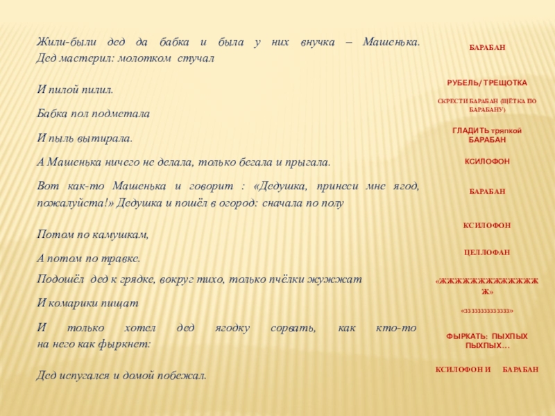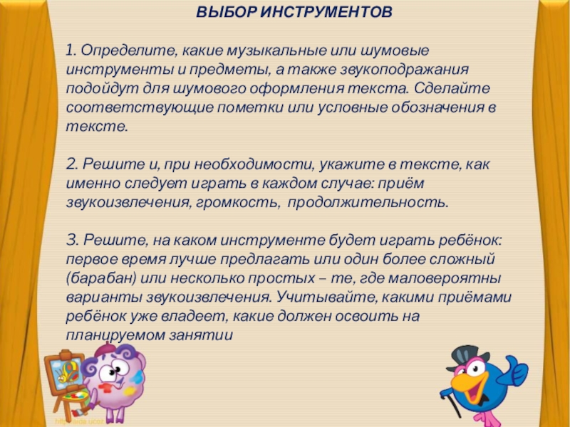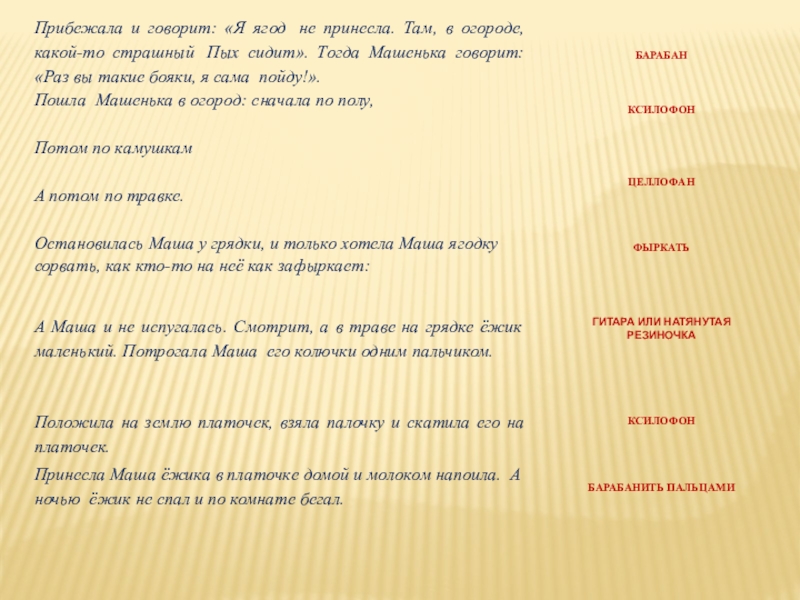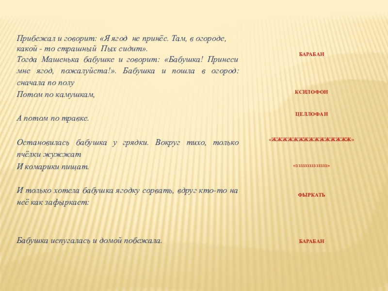 также звукоподражания подойдут для шумового оформления текста. Сделайте соответствующие пометки или условные обозначения в тексте.