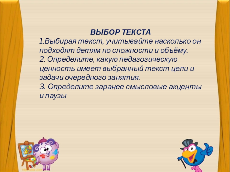 1.Выбирая текст, учитывайте насколько он подходят детям по сложности и