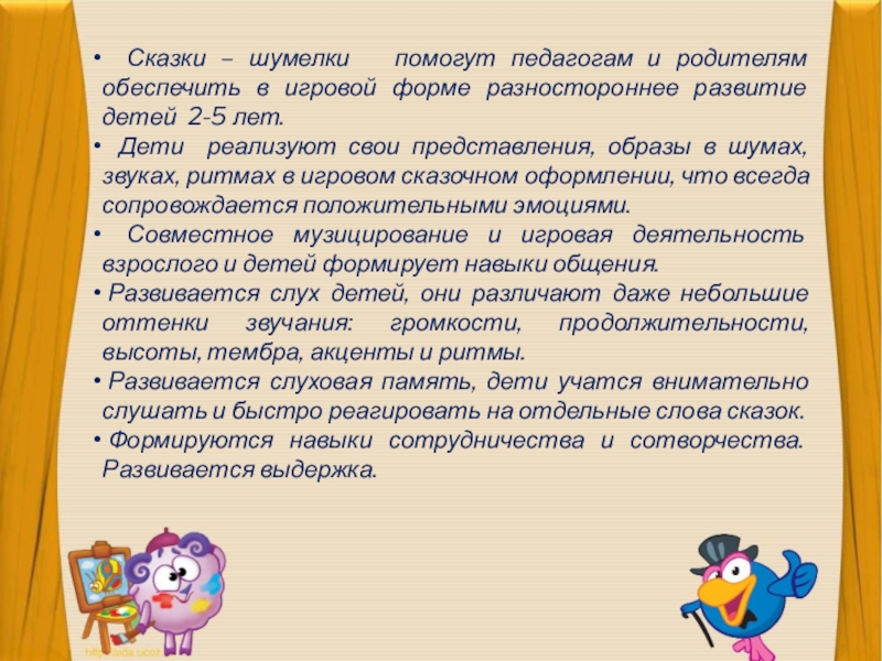 Слайд 3 Сказки – шумелки помогут педагогам и родителям обеспечить в