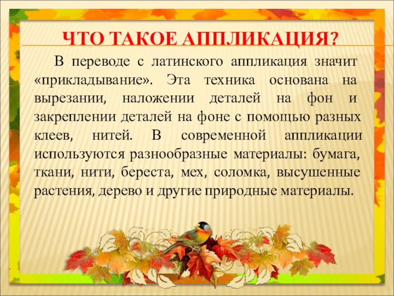 «прикладывание». Эта техника основана на вырезании, наложении деталей на фон и закреплении деталей на фоне с помощью разных клеев, нитей. В современной аппликации используются разнообразные материалы: бумага, ткани, нити, береста, мех, соломка, высушенные растения, дерево и другие природные материалы.