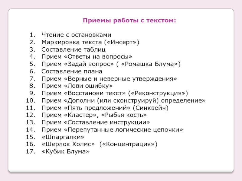 Цель: расширить знания и представления участников мастер-класса о приемах работы с текстом при организации учебного процесса, раскрыть эффективность их применения.
