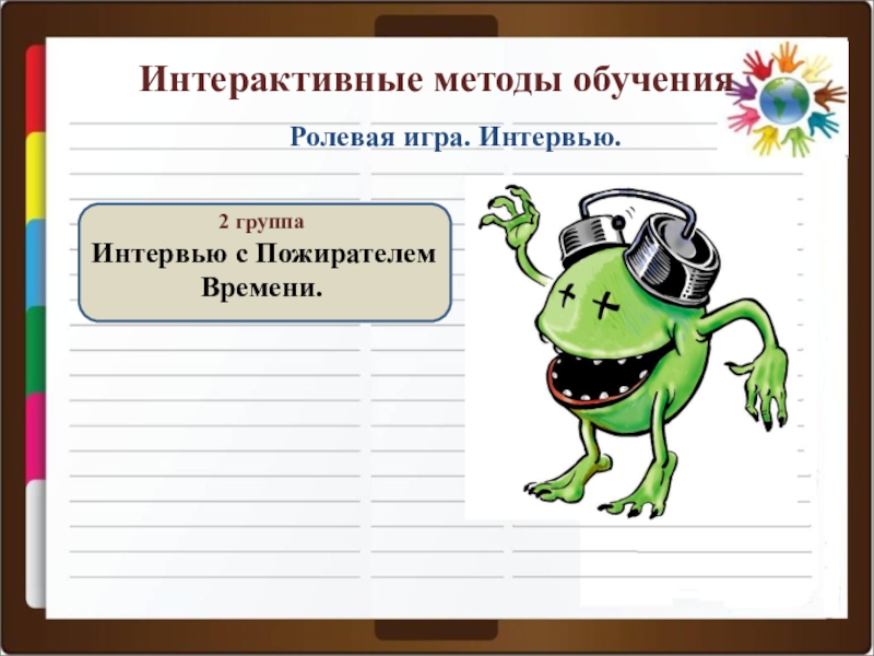 Задание: Распределить роли. На основе текста и своей фантазии журналистам придумать интересные вопросы и взять интервью у Пожирателей Времени..