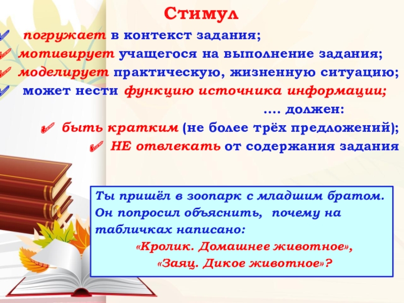 содержит информацию, необходимую для успешной деятельности учащегося по выполнению задания