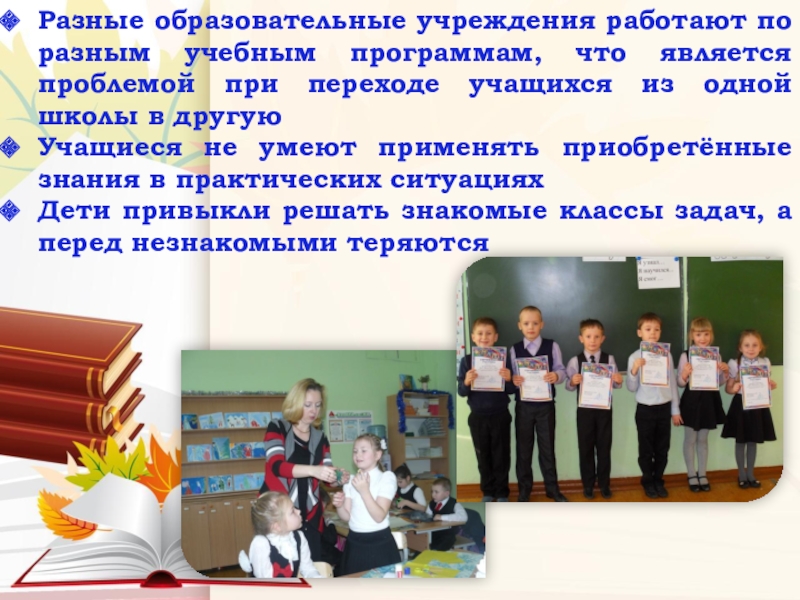 Слайд 22Разные образовательные учреждения работают по разным учебным программам, что является проблемой