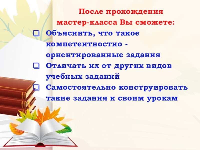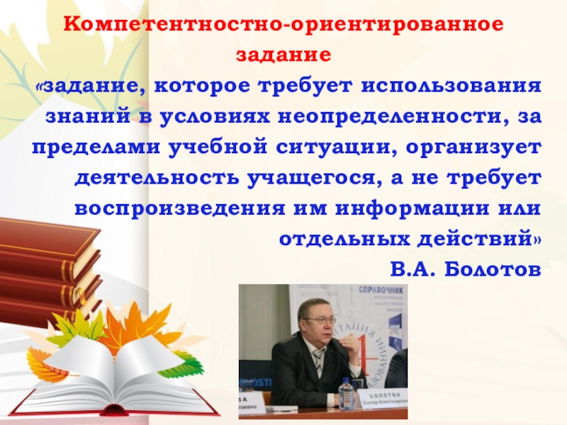 пределами учебной ситуации, организует деятельность учащегося, а не требует воспроизведения им информации или отдельных действий» В.А. Болотов