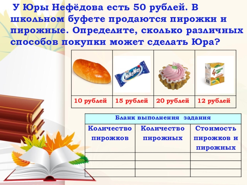 Слайд 16 У Юры Нефёдова есть 50 рублей. В школьном буфете продаются