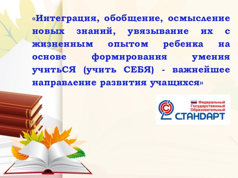 Слайд 3«Интеграция, обобщение, осмысление новых знаний, увязывание их с жизненным опытом ребенка