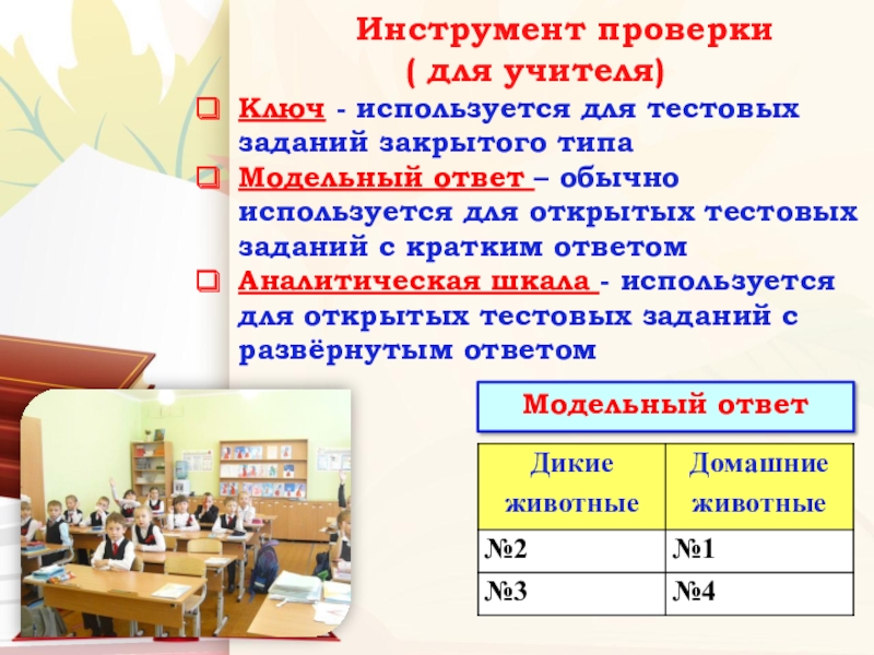Модельный ответ – обычно используется для открытых тестовых заданий с кратким ответом