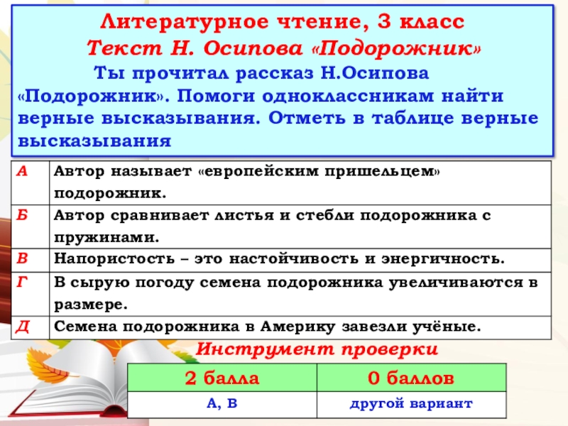 Ты прочитал рассказ Н.Осипова «Подорожник». Помоги одноклассникам найти верные высказывания. Отметь в таблице верные высказывания