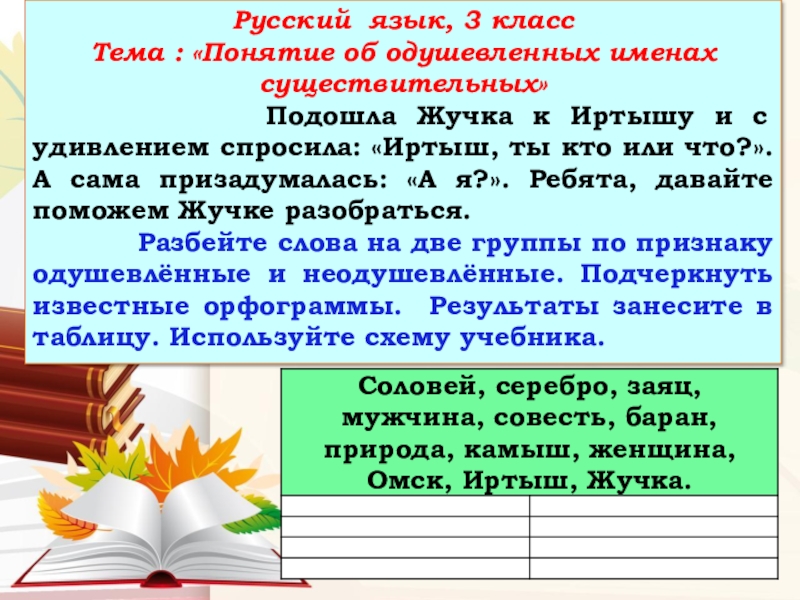 Разбейте слова на две группы по признаку одушевлённые и неодушевлённые. Подчеркнуть известные орфограммы. Результаты занесите в таблицу. Используйте схему учебника.