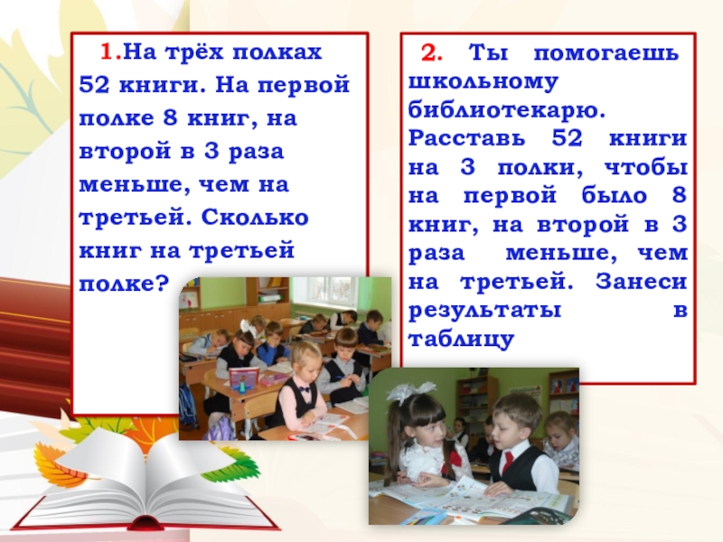 2. Ты помогаешь школьному библиотекарю. Расставь 52 книги на 3 полки, чтобы на первой было 8 книг, на второй в 3 раза меньше, чем на третьей. Занеси результаты в таблицу