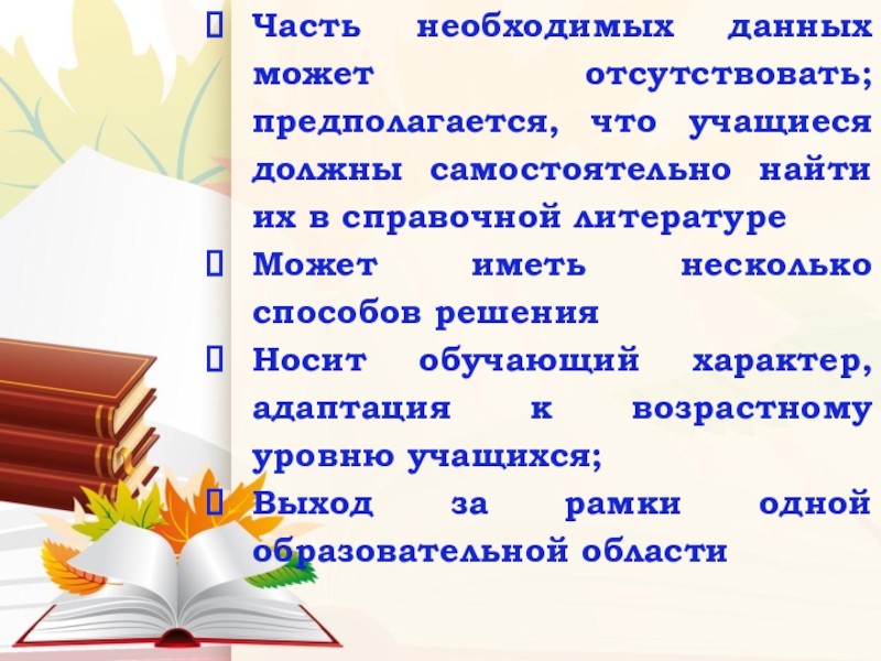 Слайд 9Часть необходимых данных может отсутствовать; предполагается, что учащиеся должны самостоятельно найти