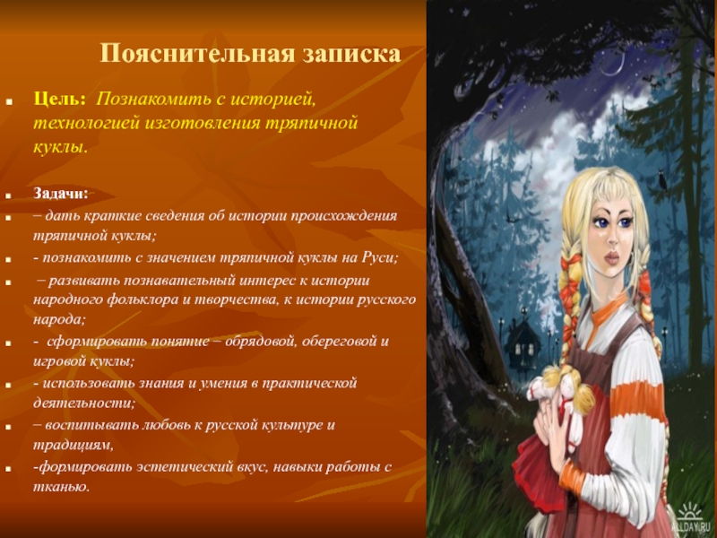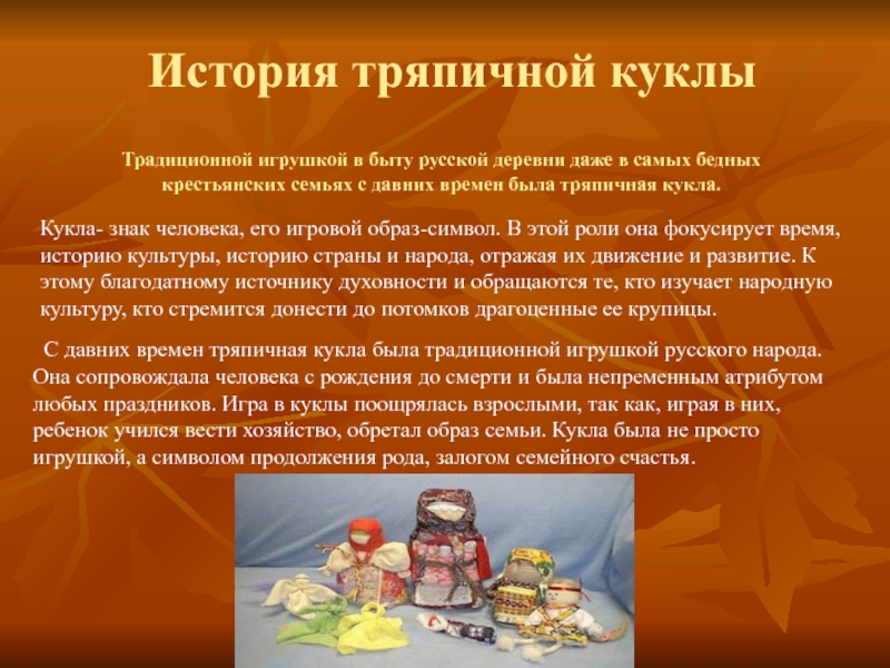 С давних времен тряпичная кукла была традиционной игрушкой русского народа. Она сопровождала человека с рождения до смерти и была непременным атрибутом любых праздников. Игра в куклы поощрялась взрослыми, так как, играя в них, ребенок учился вести хозяйство, обретал образ семьи. Кукла была не просто игрушкой, а символом продолжения рода, залогом семейного счастья.