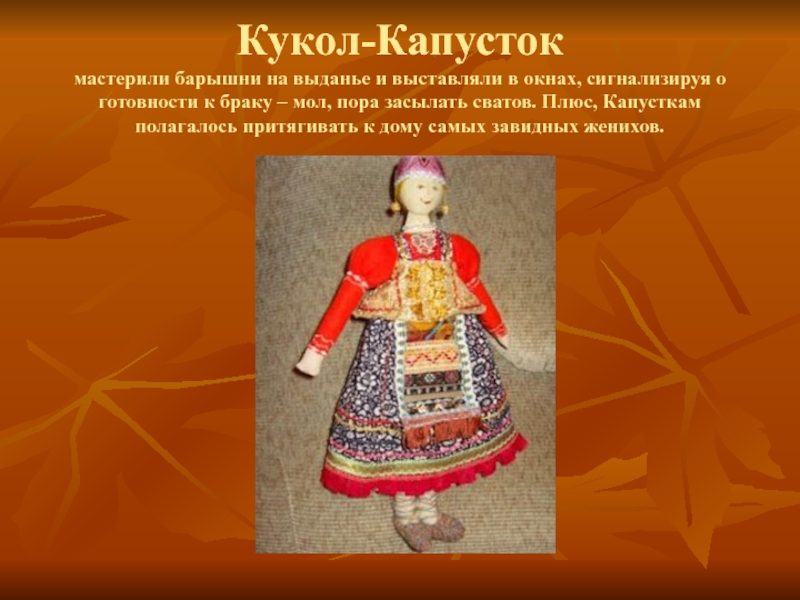Кукла- знак человека, его игровой образ-символ. В этой роли она фокусирует время, историю культуры, историю страны и народа, отражая их движение и развитие. К этому благодатному источнику духовности и обращаются те, кто изучает народную культуру, кто стремится донести до потомков драгоценные ее крупицы.