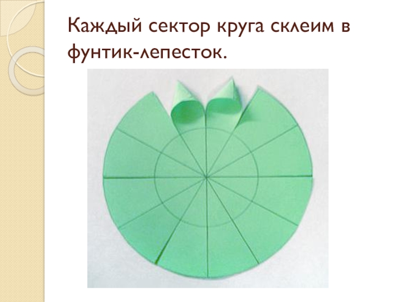 Слайд 5Каждый сектор круга склеим в фунтик-лепесток.