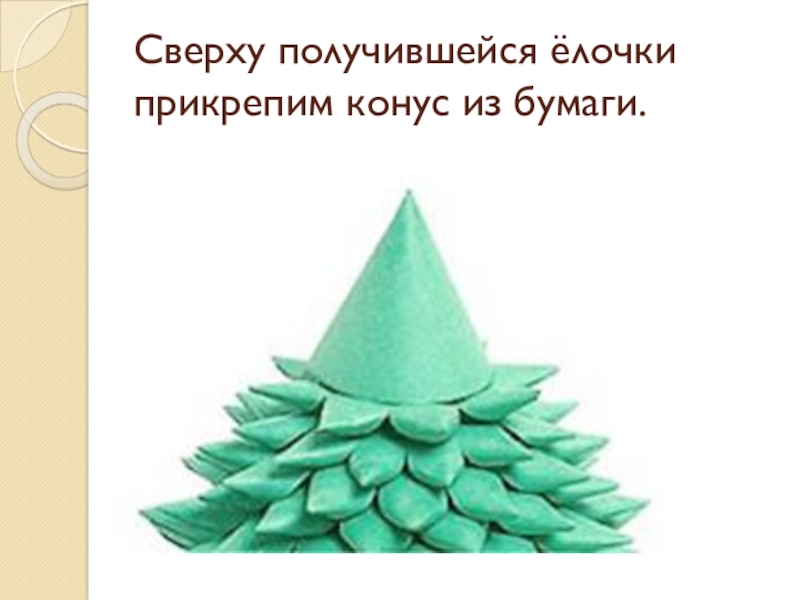 Слайд 10Сверху получившейся ёлочки прикрепим конус из бумаги.