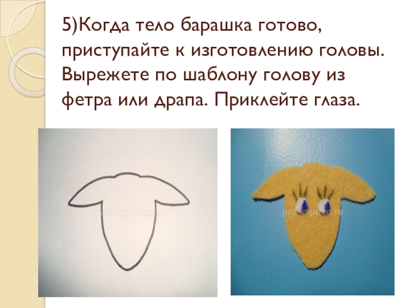 Слайд 235)Когда тело барашка готово, приступайте к изготовлению головы. Вырежете по шаблону