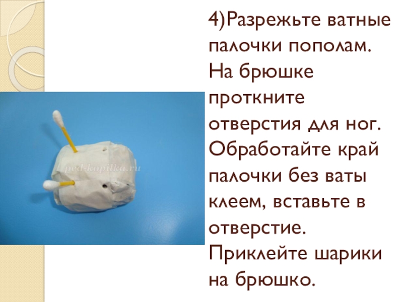 Слайд 224)Разрежьте ватные палочки пополам. На брюшке проткните отверстия для ног. Обработайте