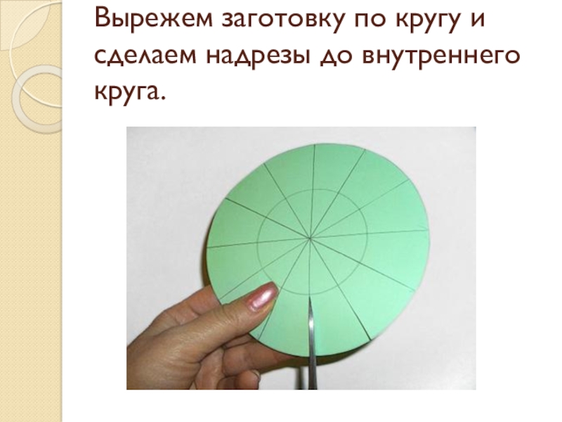 Слайд 4Вырежем заготовку по кругу и сделаем надрезы до внутреннего круга.