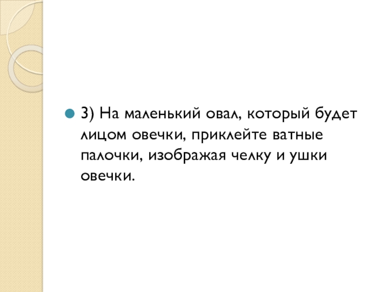 Слайд 143) На маленький овал, который будет лицом овечки, приклейте ватные палочки,