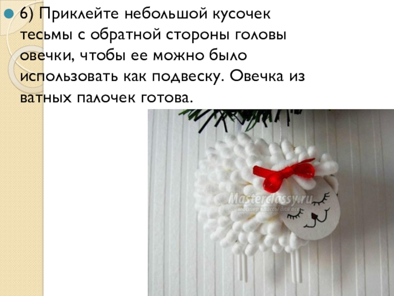Слайд 176) Приклейте небольшой кусочек тесьмы с обратной стороны головы овечки, чтобы