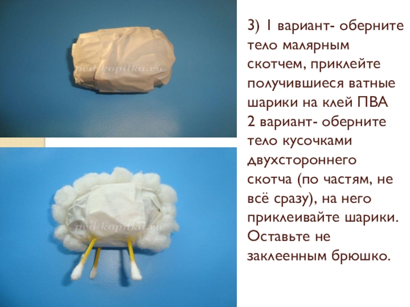 Слайд 213) 1 вариант- оберните тело малярным скотчем, приклейте получившиеся ватные шарики