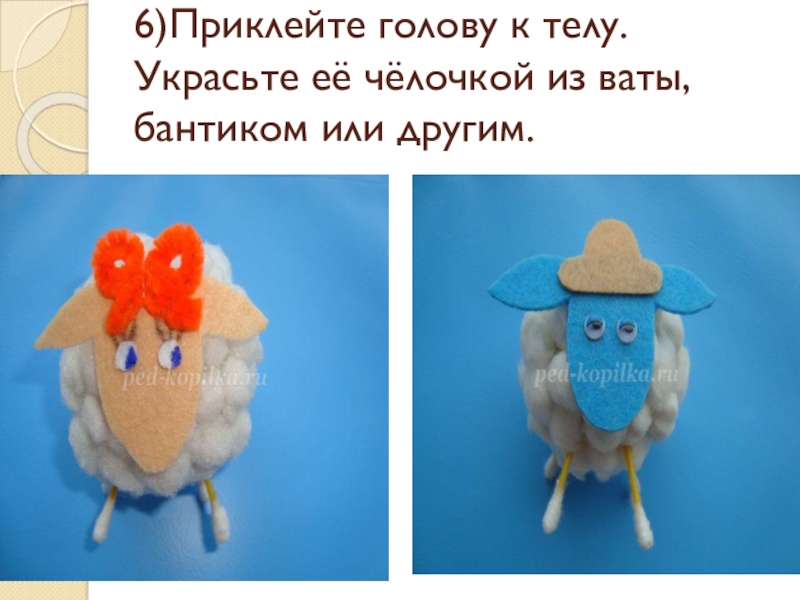 Слайд 246)Приклейте голову к телу. Украсьте её чёлочкой из ваты, бантиком или