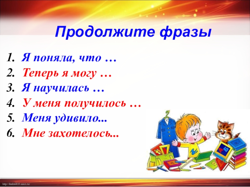 Я поняла, что … Теперь я могу … Я научилась … У меня получилось … Меня