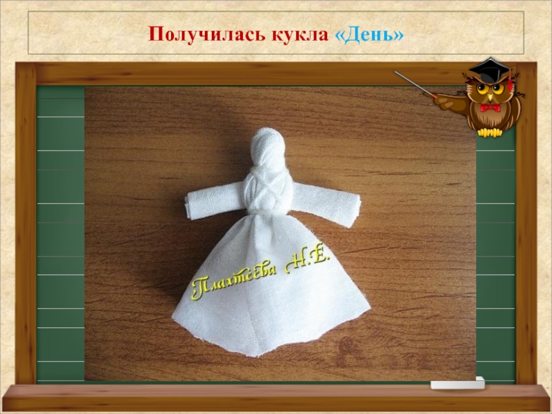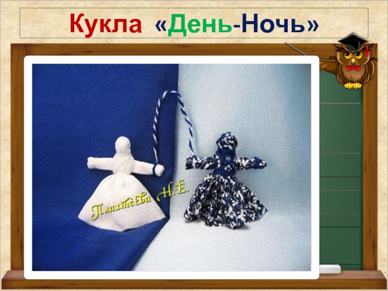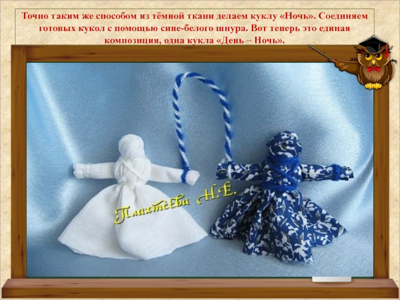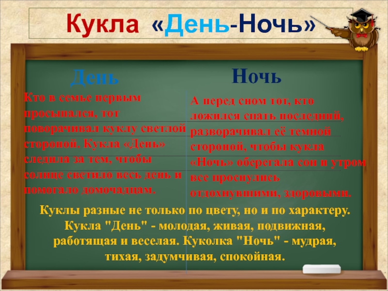 Куклы разные не только по цвету, но и по характеру. Кукла "День" - молодая, живая, подвижная, работящая и веселая. Куколка "Ночь" - мудрая, тихая, задумчивая, спокойная.