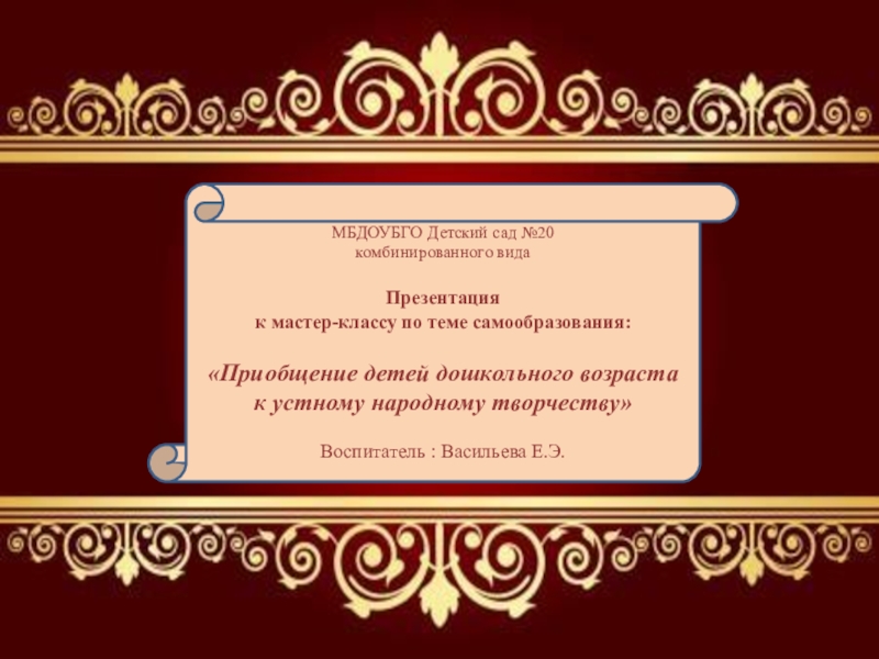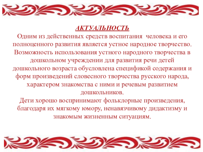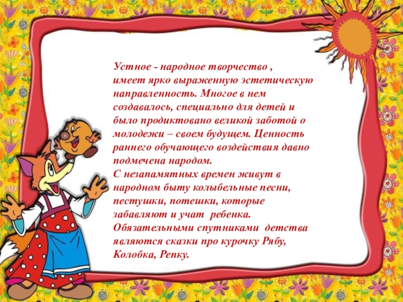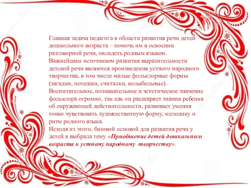 Исходя из этого, базовой основой для развития речи у детей я выбрала тему «Приобщение детей дошкольного возраста к устному народному творчеству».