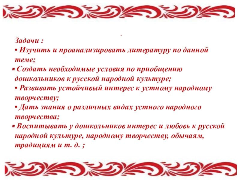 Воспитывать у дошкольников интерес и любовь к русской народной культуре, народному творчеству, обычаям, традициям и т. д. ;