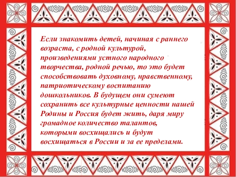Слайд 19Если знакомить детей, начиная с раннего возраста, с родной культурой, произведениями