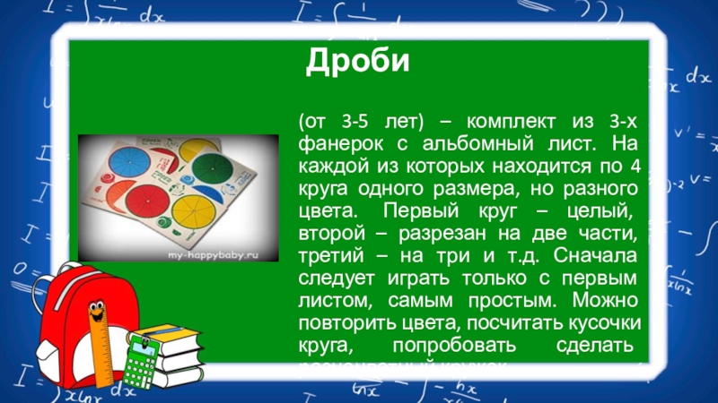 На каждой из которых находится по 4 круга одного размера, но разного цвета. Первый круг – целый, второй – разрезан на две части, третий – на три и т.д. Сначала следует играть только с первым листом, самым простым. Можно повторить цвета, посчитать кусочки круга, попробовать сделать разноцветный кружок