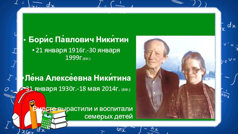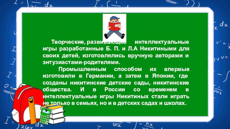 Слайд 10 Творческие, развивающие интеллектуальные игры разработанные Б. П. и Л.А Никитиными для своих
