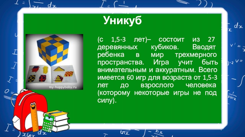 (с 1,5-3 лет)– состоит из 27 деревянных кубиков. Вводят ребенка в