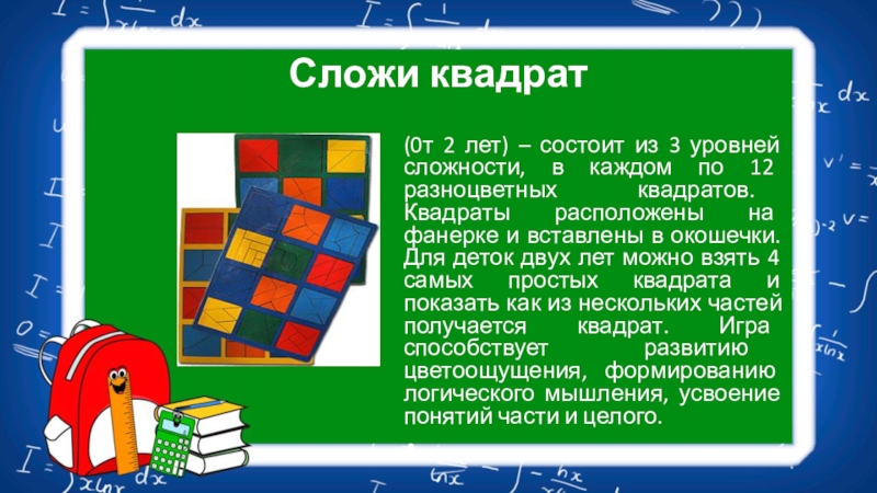 каждом по 12 разноцветных квадратов. Квадраты расположены на фанерке и вставлены в окошечки. Для деток двух лет можно взять 4 самых простых квадрата и показать как из нескольких частей получается квадрат. Игра способствует развитию цветоощущения, формированию логического мышления, усвоение понятий части и целого.