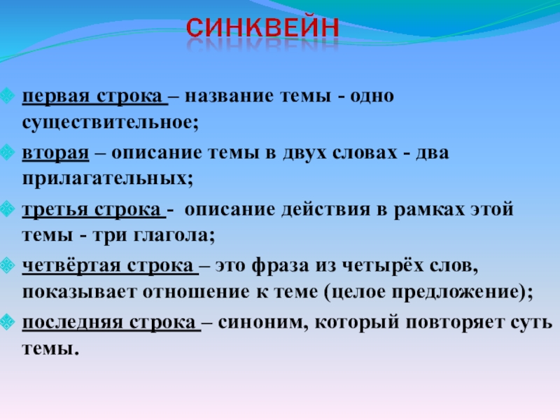 четвёртая строка – это фраза из четырёх слов, показывает отношение к теме (целое предложение);