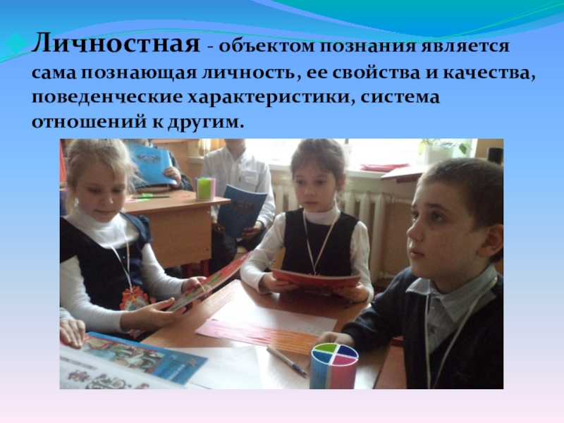 Слайд 11Личностная - объектом познания является сама познающая личность, ее свойства и