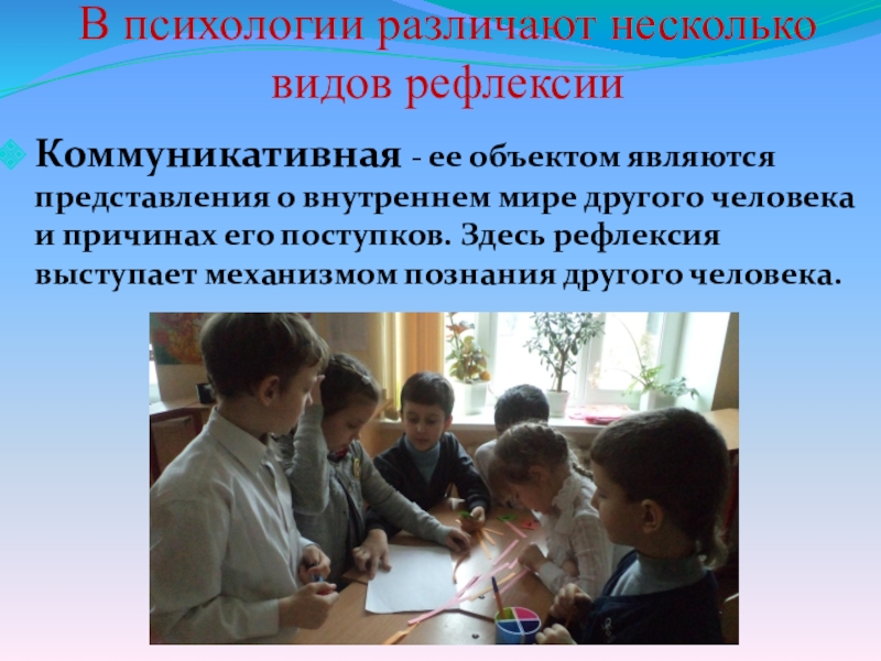 о внутреннем мире другого человека и причинах его поступков. Здесь рефлексия выступает механизмом познания другого человека.