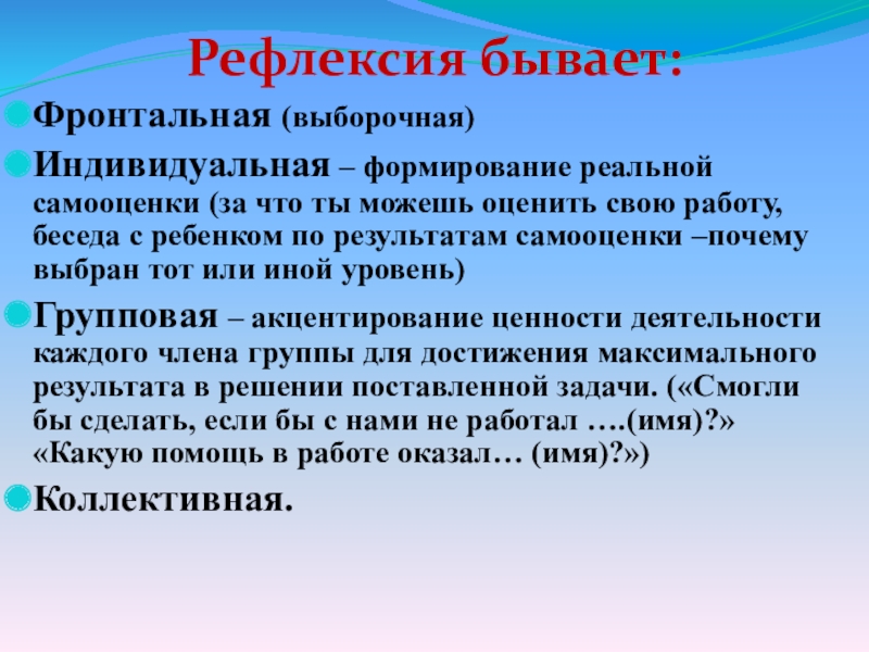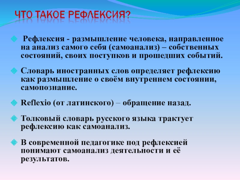 В современной педагогике под рефлексией понимают самоанализ деятельности и её результатов.