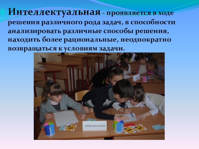Слайд 12Интеллектуальная - проявляется в ходе решения различного рода задач, в способности