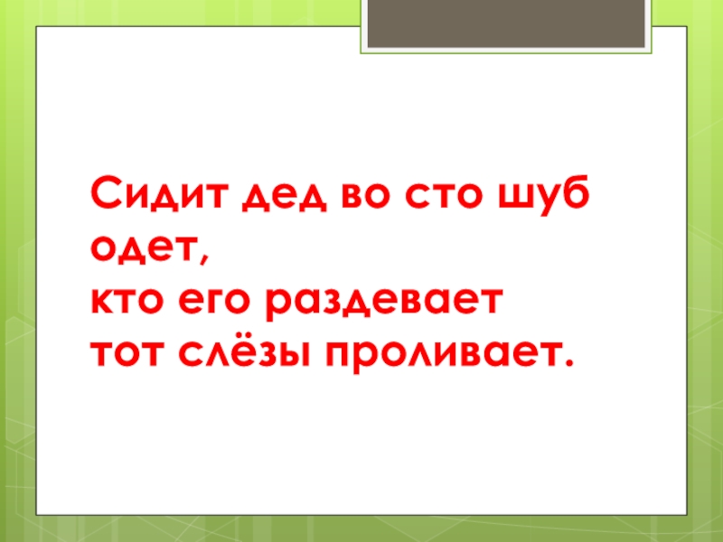 Слайд 18 Сидит дед во сто шуб одет, кто его раздевает тот слёзы проливает.
