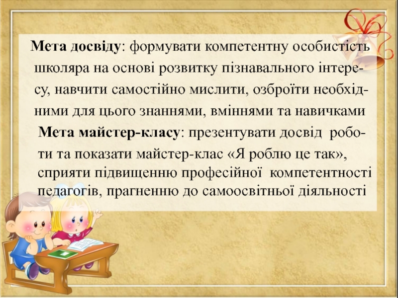 Слайд 3 Мета досвіду: формувати компетентну особистість