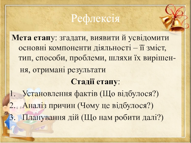 Мета етапу: згадати, виявити й усвідомити основні компоненти діяльності – її