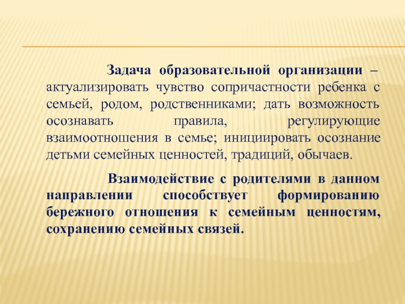 актуализировать чувство сопричастности ребенка с семьей, родом, родственниками; дать возможность осознавать правила, регулирующие взаимоотношения в семье; инициировать осознание детьми семейных ценностей, традиций, обычаев.