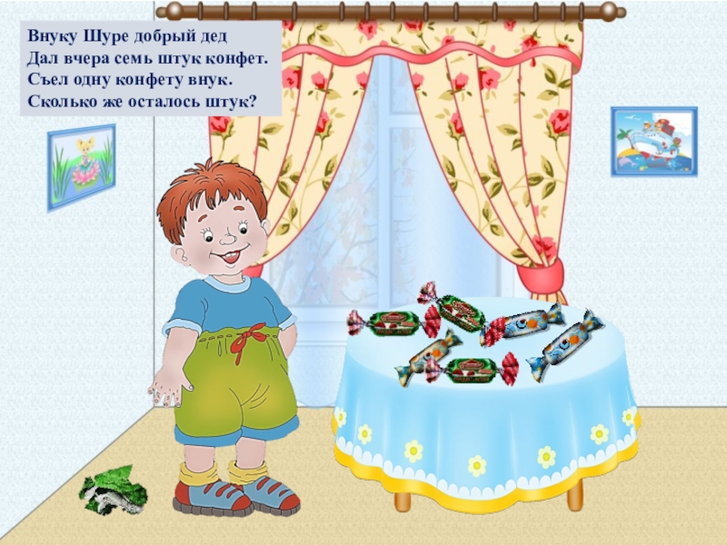 Внуку Шуре добрый дед Дал вчера семь штук конфет. Съел одну конфету внук. Сколько же осталось штук?