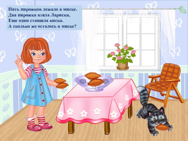 Пять пирожков лежало в миске.Два пирожка взяла Лариска,Еще один стащила киска.А сколько же осталось в миске?