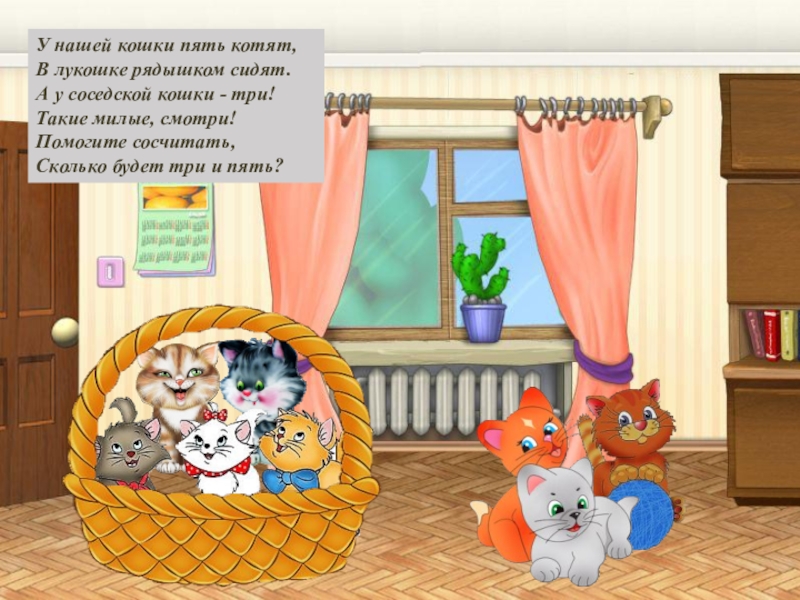 Слайд 9У нашей кошки пять котят, В лукошке рядышком сидят. А у