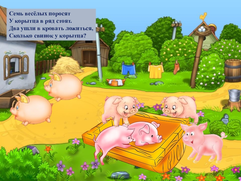 Семь весёлых поросятУ корытца в ряд стоят.Два ушли в кровать ложиться,Сколько свинок у корытца?