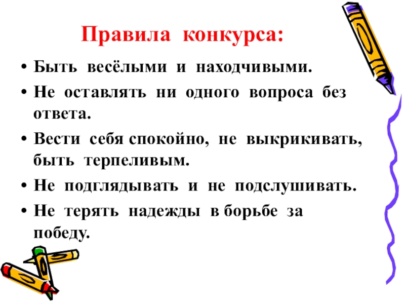 Правила конкурса: Быть весёлыми и находчивыми.Не оставлять ни одного вопроса без ответа.Вести себя спокойно, не выкрикивать, быть